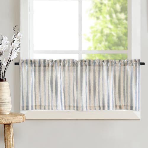 TOPICK Randig fönstergardin av linne, halvtransparent bistrogardin, gardin för små fönster i kök, vardagsrum och på lantställe, 1 st., B 125 x H 45 (cm), blå på beige