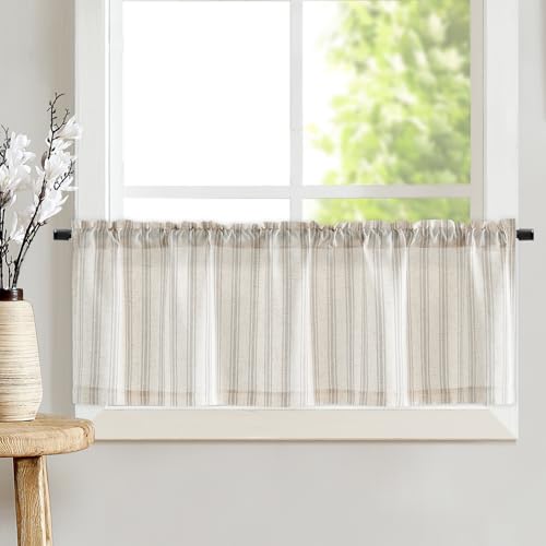 TOPICK Linne, randig fönstergardin, ljusgenomsläpplig bistrogardin, sheer gardin, privat gardin, gardin för små fönster, kök, vardagsrum, lantställe 1 st 125 B x 45 H (cm) grå på beige