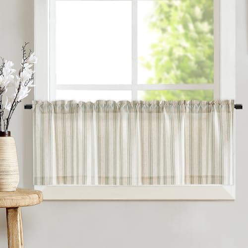 TOPICK Randig fönstergardin av linne, halvtransparent bistrogardin, gardin för små fönster i kök, vardagsrum och på lantställe, 1 st., B 125 x H 45 (cm), grön på beige