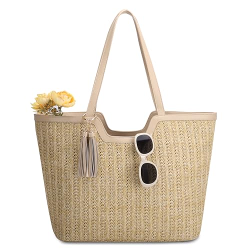 VASCHY Strandväska dam, handväska sommarväskor flätad tygväska plånböcker för resor semester, Beige, Large