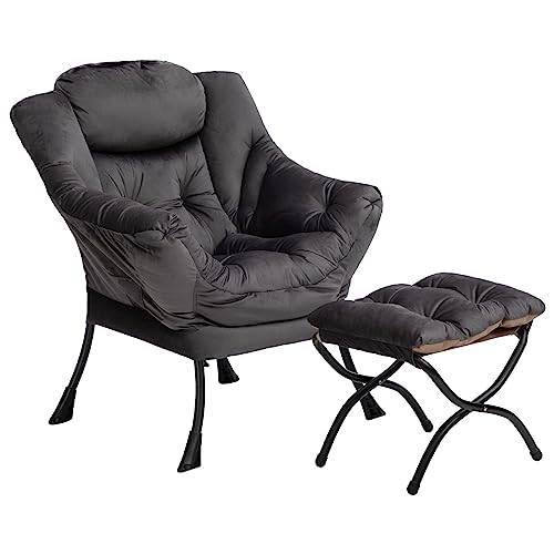 HollyHOME Fåtölj Med Fotpall - Relax Fåtölj För Vardagsrum Och Sovrum, Bekväm Läsfåtölj i Sammet, Accentstol Med Stålram - Mörkgrå