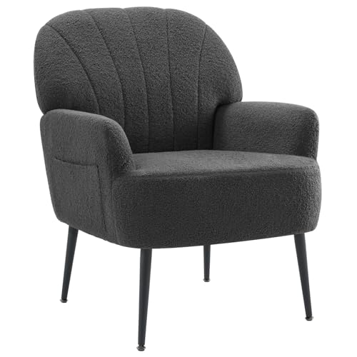 IWMH Fåtölj för vardagsrum, fluffigt teddytyg, accentstol för sovrum, clubfåtölj, lässtol, bekväm stor extrastol i 1950-talsstil, metallben, mörkgrå