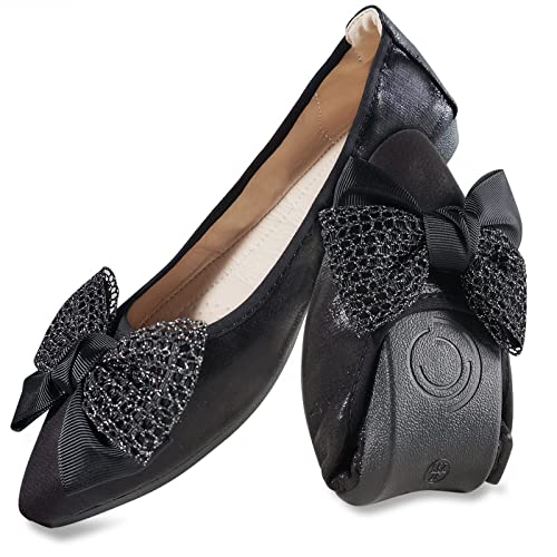 MACHSWON Dam balettskor glittrande bekväma avslappnade spetsiga tårosettknut dra på bröllop ballerina uppklädda skor kvinnor, Svart02, 38 EU