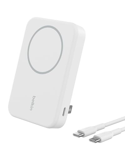 Belkin BoostCharge Pro trådlös powerbank 8000 mAh med Qi2, MagSafe-kompatibel bärbar laddare + inbyggt utfällbart stöd - För iPhone 16, 16 Plus, 16 Pro, 16 Pro Max, iPhone 15, m.fl. - Vit