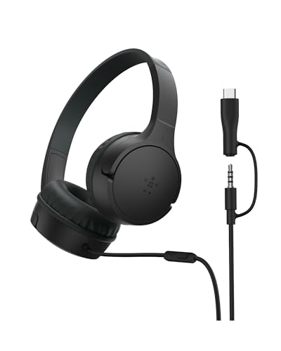 Belkin SoundForm Kids trådlösa hörlurar med inbyggd mikrofon, utanpåliggande headset för onlineutbildning av flickor och pojkar, skola, resekompatibel med iPhone, iPad, Galaxy och fler - Svart