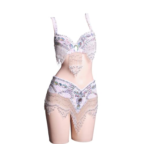 Belly Dance Sequin Skirt for Waist Circumference with Bra Top Halloween Sparkly Fringe Skirt for Women (Pink,Medium)