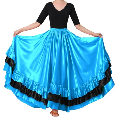 BACKGARDEN Women Black Red Layers Satin Long Skirt for Spanish Flamenco Belly Dance Gypsy Mexico Ballet Folklorico Performance Costume (Lake Blue Theme)