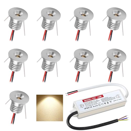 DYKUWEY LED infälld spotlight, 12 V, 1 W mini LED-spotlight, IP65, hål Φ16 mm, kök, trappa, skåp, hall, gör-det-själv-belysning, 9 st (silver varmvit 3 000 K)