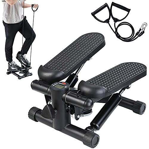 BAKAJI Stepper Fitness Cardio Ben Mage Höfter med LCD-display Kaloritid och Elastiska Hantlar Träning Armaxlar Rostfritt Stålram Halkfria Pedaler (svart)