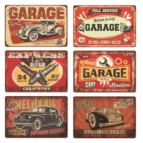 MHMondawn Set med 6 retro garage dekorativa skyltar, plåtskyltar retro, motorcykelmetallskylt, bensin väggskylt, bil, affisch, motorolja, laddning, metallskyltar, husvägg, rumsdekoration, bar