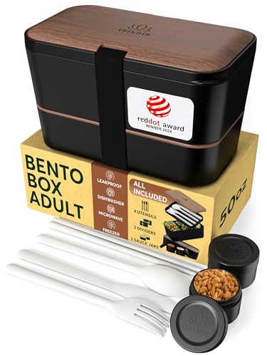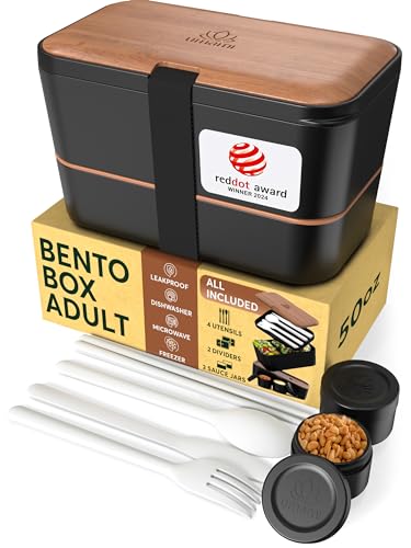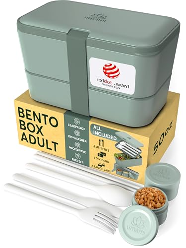 Umami Bento Lunch Box, 2 såsburkar och träbestick ingår, mikrovågsugnslunchlåda, matlåda för vuxna, matlåda i fack, Bento Lunch Box, Bento Box