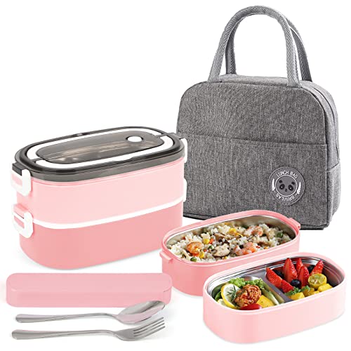 Daelesr 1 pack återanvändbara lunch bentolådor, matlåda för mat med bestick, Bento lunchlåda, 3 fack Stackable Food Storage Container Bärbar, läckagesäker för vuxna barn 900 ml (rosa)