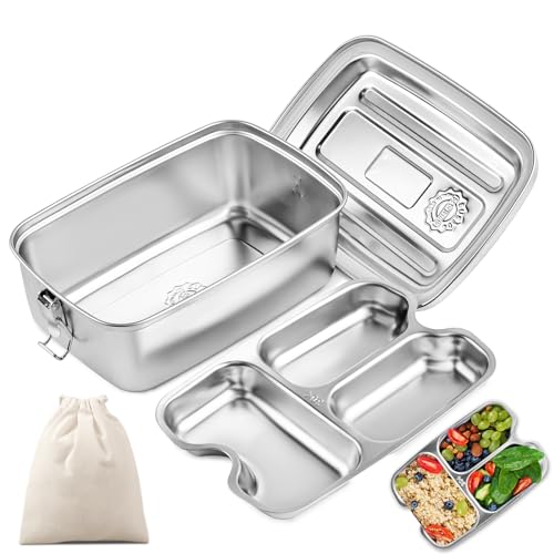 HOSPAOP Lunchlåda i rostfritt stål, matlåda i rostfritt stål med 3 fack, 16 x 13 x 6,2 cm, 1 000 ml, Bento Box jutebox för barn vuxna