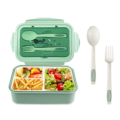 Newpop Lunchlåda med 3 fack och sked gaffel, 1 400 ml, BPA-fri bento, matlåda för mikrovågsugn och diskmaskin, för vuxna, barn, skolarbete, grön