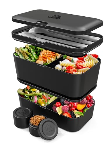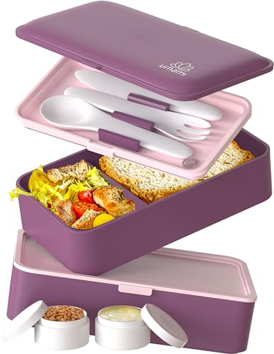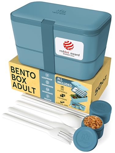 Umami Allt-i-ett-bentolåda på 1 200 ml för vuxna/barn med 1 såsburk och 4 bestick, BPA-fri lunchlåda för män/kvinnor, 2 meal-prep-lådor, för mikrovågsugn, diskmaskin och frys