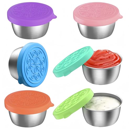 VINEST 6 stycken dressingsbehållare med silikonlock, 50 ml rostfritt stål salladsdressingsbehållare, små burkar bentolåda tillbehör läckagesäkra, camping miniburkar med lock, snackslåda för barn
