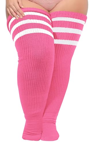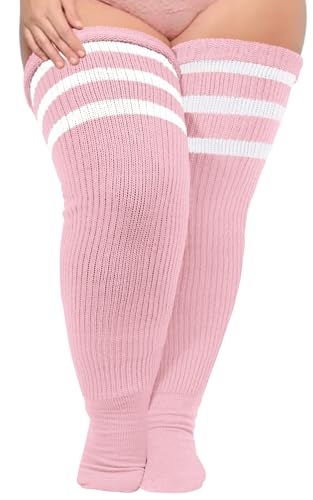 Plus size lårhöga strumpor för tjocka lår- extra långa randiga tjocka över knästrumpor - benvärmare stövelstrumpor, Rosa och vit, Large Plus