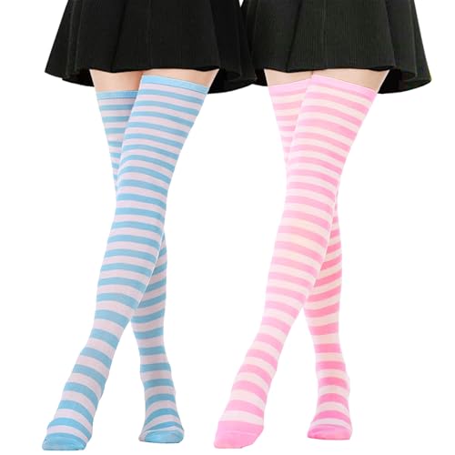 AQOKKA Extra långa lårhöga strumpor för kvinnor randiga lårstrumpor långa stövlar lårhöga strumpor benvärmare, 2 par extra långa: Rosa och vit, blå och vit, Extra Long Size