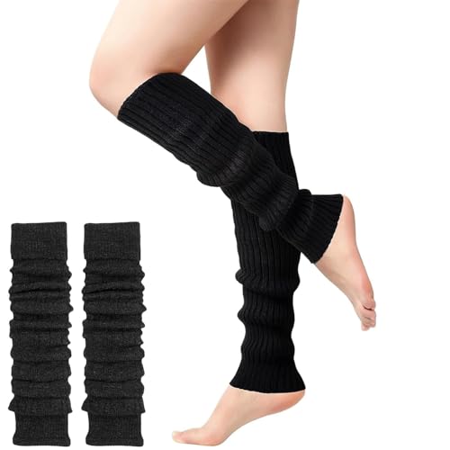 AWAVM 2 par benvärmare, 40 cm vinterstickade ribbade benvärmare för kvinnor flickor yoga balettdans skridskoåkning, tillbehör, svart och vit, Svart, en storlek