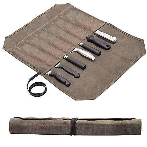 Vaxad kanvas kock kniv rulle väska slitstark förvaring kniv bestick verktygsfodral med 6 fack omslagsrem, Khaki, Verktygskniv