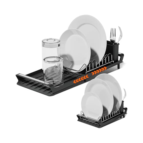 Avilia - Svart utdragbart diskställ med 8 diskställ, inbyggt bestickställ, perfekt för handfat och handfat, lätt att rengöra och platsbesparande