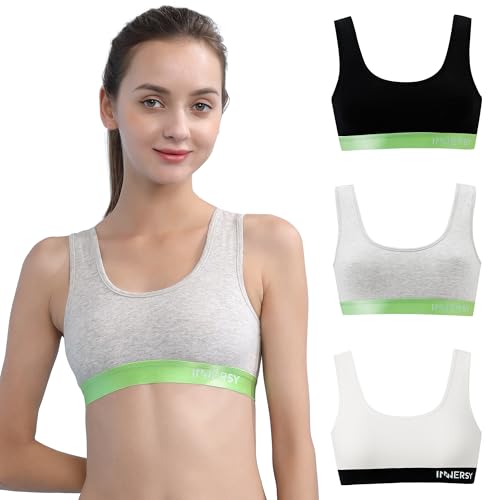 INNERSY Bustier, flicka, bomull, sport-bh utan bygel, bralette, barn till tonåringar, storlek 116–164, 3-pack, Vit/svart/grå, 14-16 År