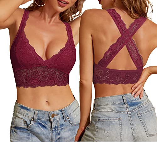 SHEKINI BH dam utan bygel framknäppt behå spets bustier djup urringning avtagbar vadderad bh bekväm bygellös bralette topp sexiga underkläder underkläder underkläder, Vinröd, M