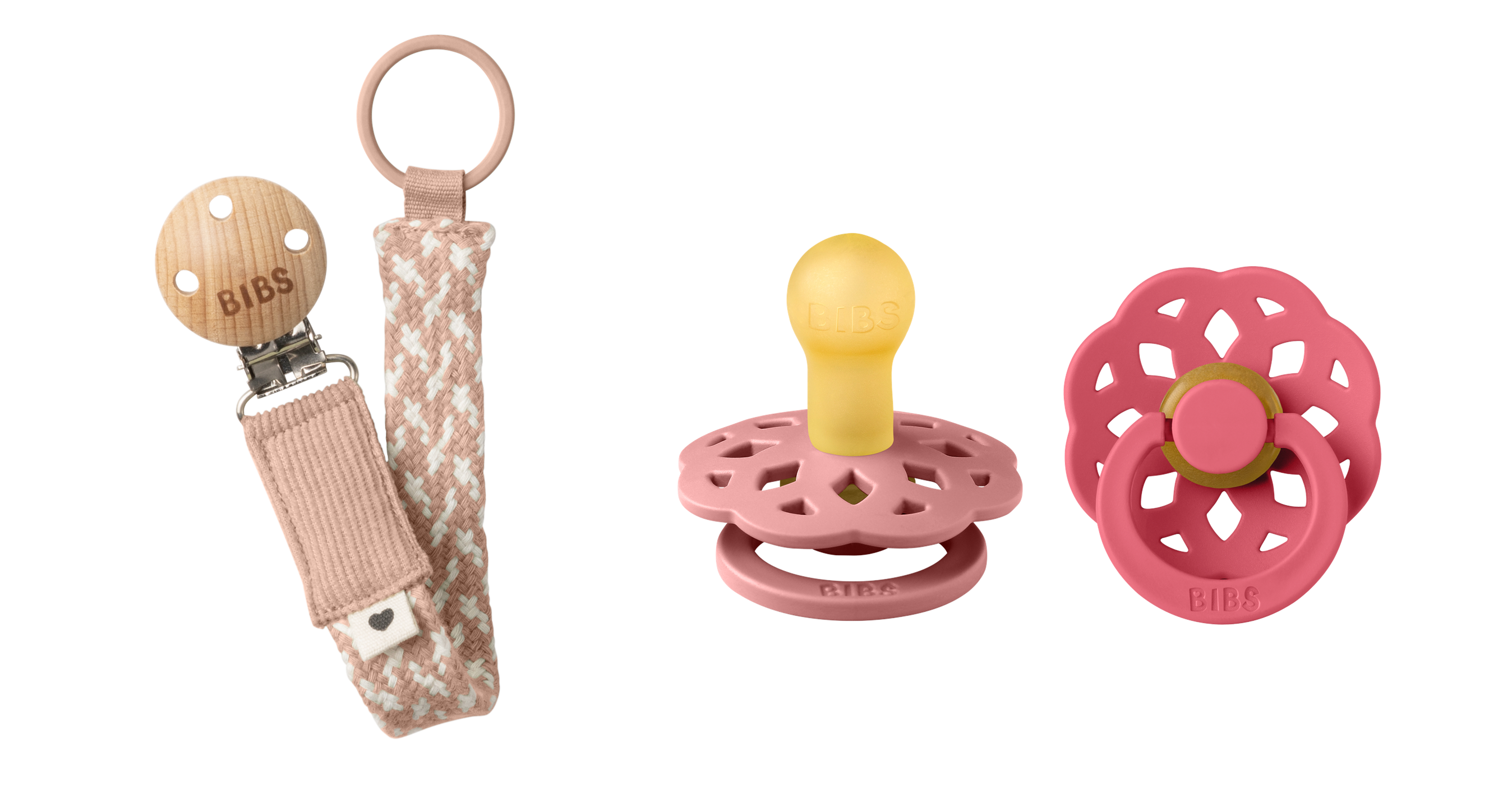 BIBS - Pacifier Boheme 2 PACK - Dusty Pink/Coral - Size 1 + Pacifier Clip Braided - Blush/Ivory - Onesize (Bundle)