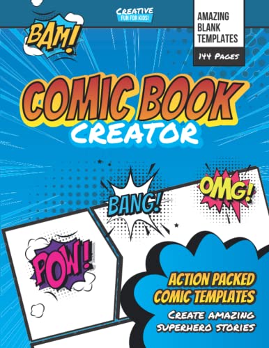 Comic Book Creator with blank action notebook pages. Creative fun for kids, manga and superhero artists. Draw and sketch comic book stories on 144 blank templates with this big sketchbook.