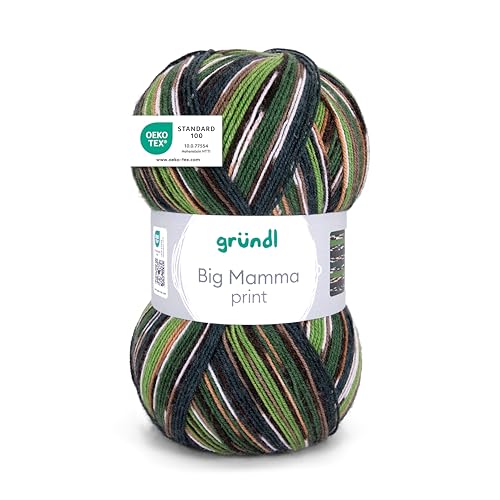 Gründl Ull Big Mamma Print – XXL-ull för stickning med färggradient – mjuk och hudvänlig – 100% polyakryl – 1 nystan 400 g/1040 m – nåltjocklek 3,5–4,5 – senapspumpa-koppar-råbrun mossa