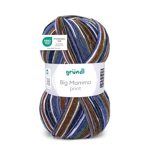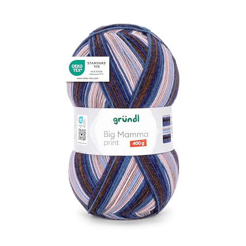 Gründl Ull Big Mamma Print – XXL-ull för stickning med färggradient – mjuk och hudvänlig – 100% polyakryl – 1 nystan 400 g/1040 m – nåltjocklek 3,5–4,5 – jeansblå-hasselnöt-åtkomst