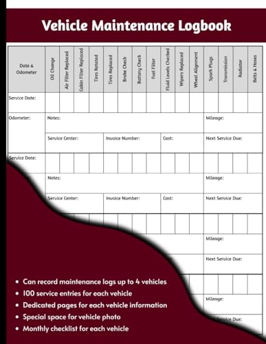 Vehicle Maintenance Log Book: For Up To 4 Vehicles: Repair & Service Record For Cars, Trucks, Bikes | Track Replacements, Oil Changes, Mileage and Expenses For Vehicles | 8.5x11 Inches | 120 Pages