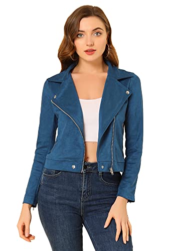 Allegra K Women's Short Soft Zip Up Faux Suede Biker Moto Jacket Medium Dark Blue