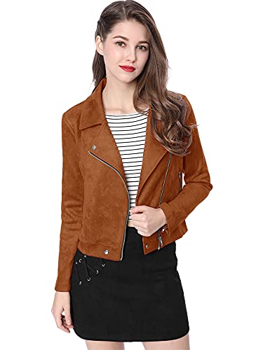 Allegra K Women's Short Soft Zip Up Faux Suede Biker Moto Jacket Medium Brown