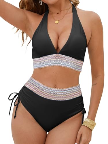 HAWILAND Bikini damset push up badmode färgblock hög midja baddräkt med dragsko elegant strandkläder, tvådelad baddräkt, svart, L