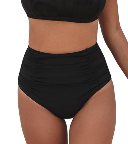 CUPSHE Dam hög midja bikini underdel skjorta magkontroll baddräkt full täckning retro badbotten (XS-4XL), Svart, L