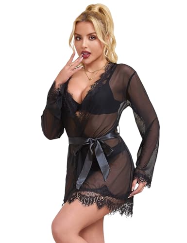 ohyeahlady Kimono dam sexig nätrock transparent morgonrock stora storlekar sexiga underkläder nattlinne spets underkläder set badrock bikini cover up strandklänning med G-string bälte svart, svart