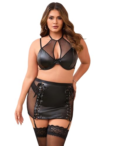 ohyeahlady Plus Size damunderkläder PU läder babydoll med strumpeband och G-string set underkläder BH justerbar bygel push up bikini mini kjol nattlinnen teddy svart, L, Svart, L