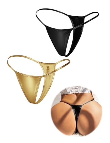 ohmydear Dam stringtrosa sexig chic tanga string konstläder G-string t-rygg underkläder plusstorlek damunderkläder sexiga trosor bikini triangel string låg midja, 2-pack - svart + guld, S