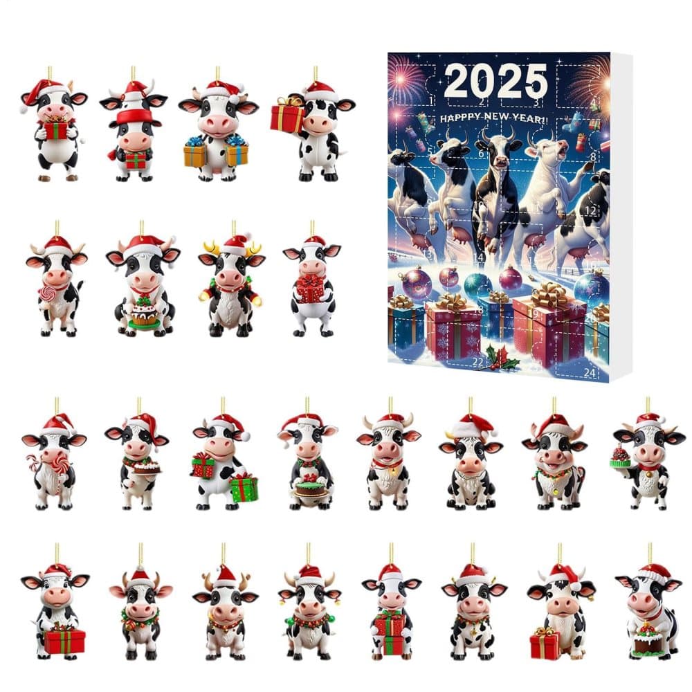 OBOSOE Julkalender för 2025 – Old Man Cow med 24 2D Tecknade Ko Pendel, Söt Ko Juldekoration, Perfekt för Julklappar, Fester och Bilar