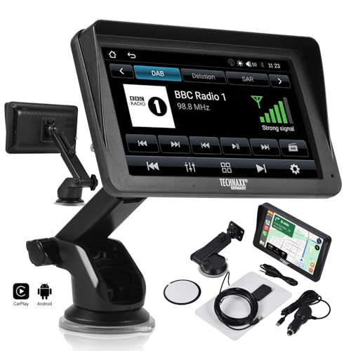 Technaxx Trådlös CarPlay & Android Auto Monitor med DAB Radio – 7 Tum Pekskärm för Bil, Bluetooth 5.0, FM & AUX Ljudöverföring, Digitalradio, Vindrutehållare – TX-361