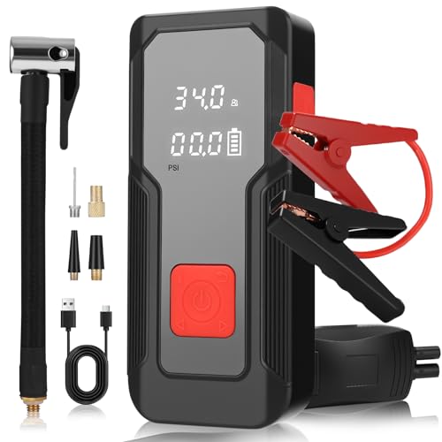 Starthjälp powerbank för bil, 5-i-1 bil starthjälp 150 PSI 2000A toppström för all bensin och 10,0 l dieselmotor 8 000 mAh 15 V Jump Starter bärbar LCD-skärm och LED-ficklampa