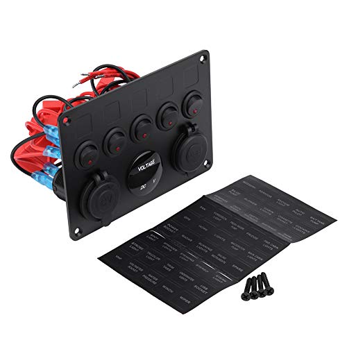 Greluma 1 Styck 5 vägs vippbrytarpanel med strömbrytare, 15A inbyggd säkring, digital voltmeter, USB laddare och 12V cigarettändaruttag för marin båt, bil
