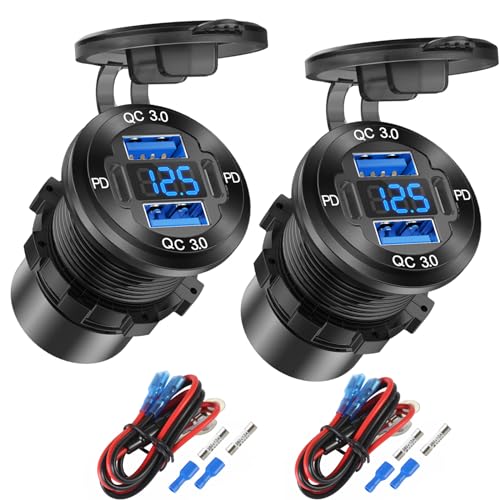 Daakro 2 stycken USB-laddningsuttag 12 V billaddare med voltmeter 72 W QC3.0 USB och dubbel PD3.0 typ C mobiltelefon snabbladdare vattentät med strömbrytare för 12 V/24 V husvagn, bil, motorcyklar,