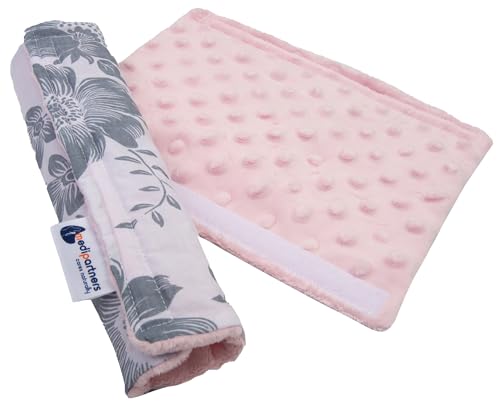 Medi Partners Bälteskudde barn bilbälte stoppning bältesskydd för bil – 17 x 22 cm 100% bomull minky axelskydd barn bälte skydd säkerhetsbälte (blomma med ljusrosa minky)