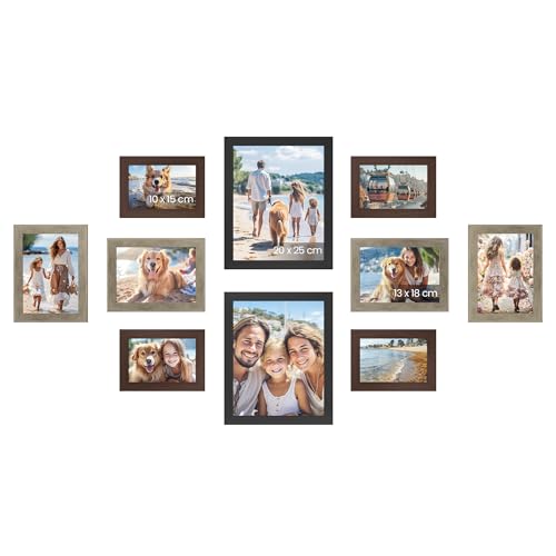 SONGMICS set med 10 fotoramar, för 2 bilder i 20 x 25 cm, 4 foton i 13 x 18 cm, 4 foton i 10 x 15 cm, plastskiva, MDF, rödbrun, gråmelerad, asksvart RPF310K03