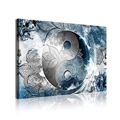 DekoArte 372 - Moderna bilder digitalt konstnärligt bildtryck | Dekorativ duk för ditt vardagsrum eller sovrum | Ying Yang stil abstrakta Zen silverfärger blå | 1 stycken 120 x 80 cm