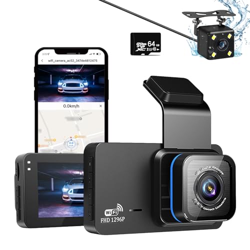 Greatzer 1296P Dashcam bil fram bak, bilkamera, bilkamera med 64G SD-kort, wifi och APP, GPS, loop-inspelning, 3 tum IPS-skärm, 140° vidvinkel, backkamera, max 128 GB