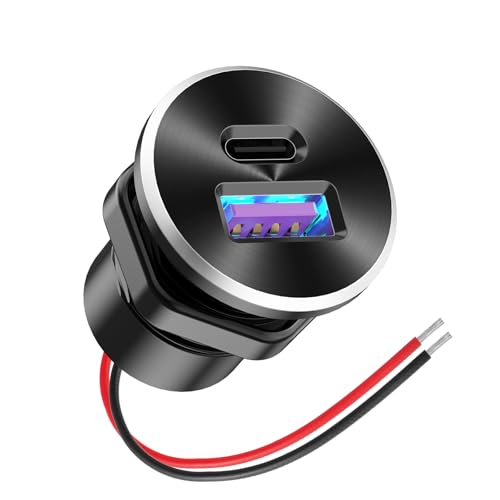 12V USB-uttag med kabel Aluminium billaddare med flera portar, dubbla USB Quick Charge 3.0-portar och PD USB C-uttag med voltmeterbrytare för bilbåt, marin lastbil, RV, snabbladdning