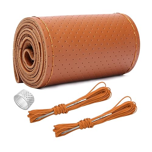 Ziciner Rattskydd i äkta läder, söm på omslaget, andningsbart halkfritt rattskydd för bilmodell med maxdiameter 35 cm, gör-det-själv-sömnad med nåltråd (brun, hål)